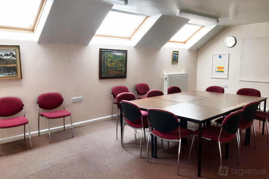 The separate meeting room, measuring 7 meters x 4 meters, is a bright, day-lit room featuring three Velux windows. It comes with tables and chairs and a small kitchen. Plus, it offers full wheelchair accessibility with step-free access.