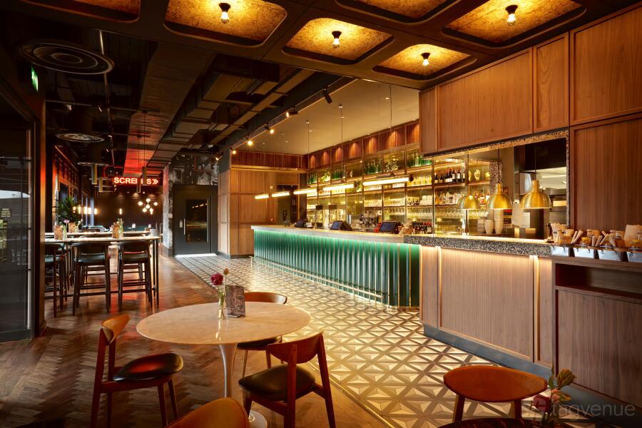 Everyman Horsham, located in the heart of Piries Place, combines retro charm with industrial style. Visitors enter through a festoon-lit canopy into a striking double-height foyer. From there, a concrete staircase leads up to the main bar and dining area, blending luxurious and raw materials.