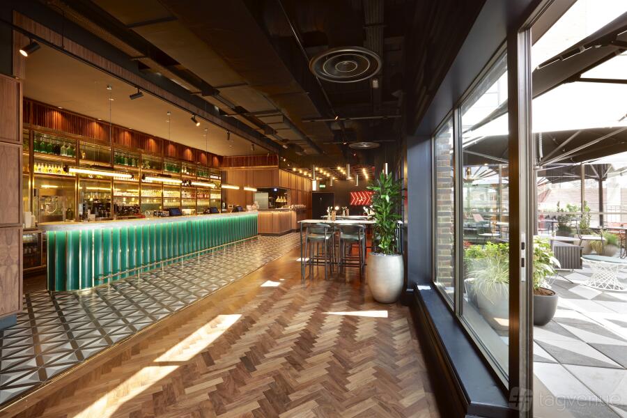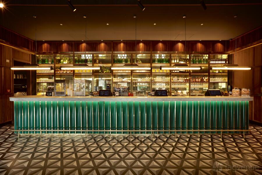 On the first floor, the grand bar and lounge area are divided into cozy sections with unique characters. Guests can watch the semi-open kitchen, clad in rich walnut while enjoying a Spielburger. The covered terrace offers a relaxing spot with views of Piries Place Plaza.