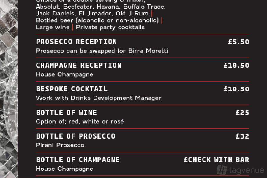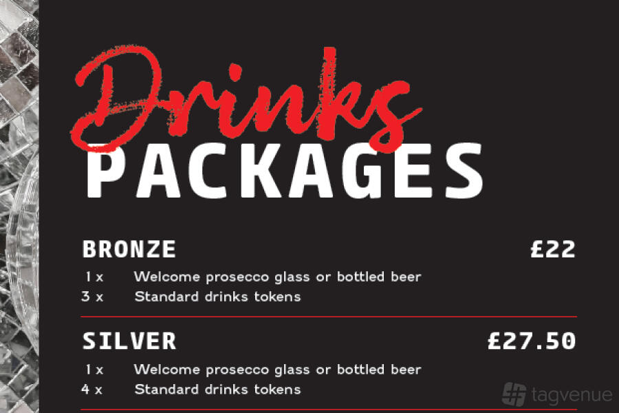 Silver Package £27.50pp 1 x Welcome prosecco glass/Bottled beer & 4 x Standard Drinks tokens