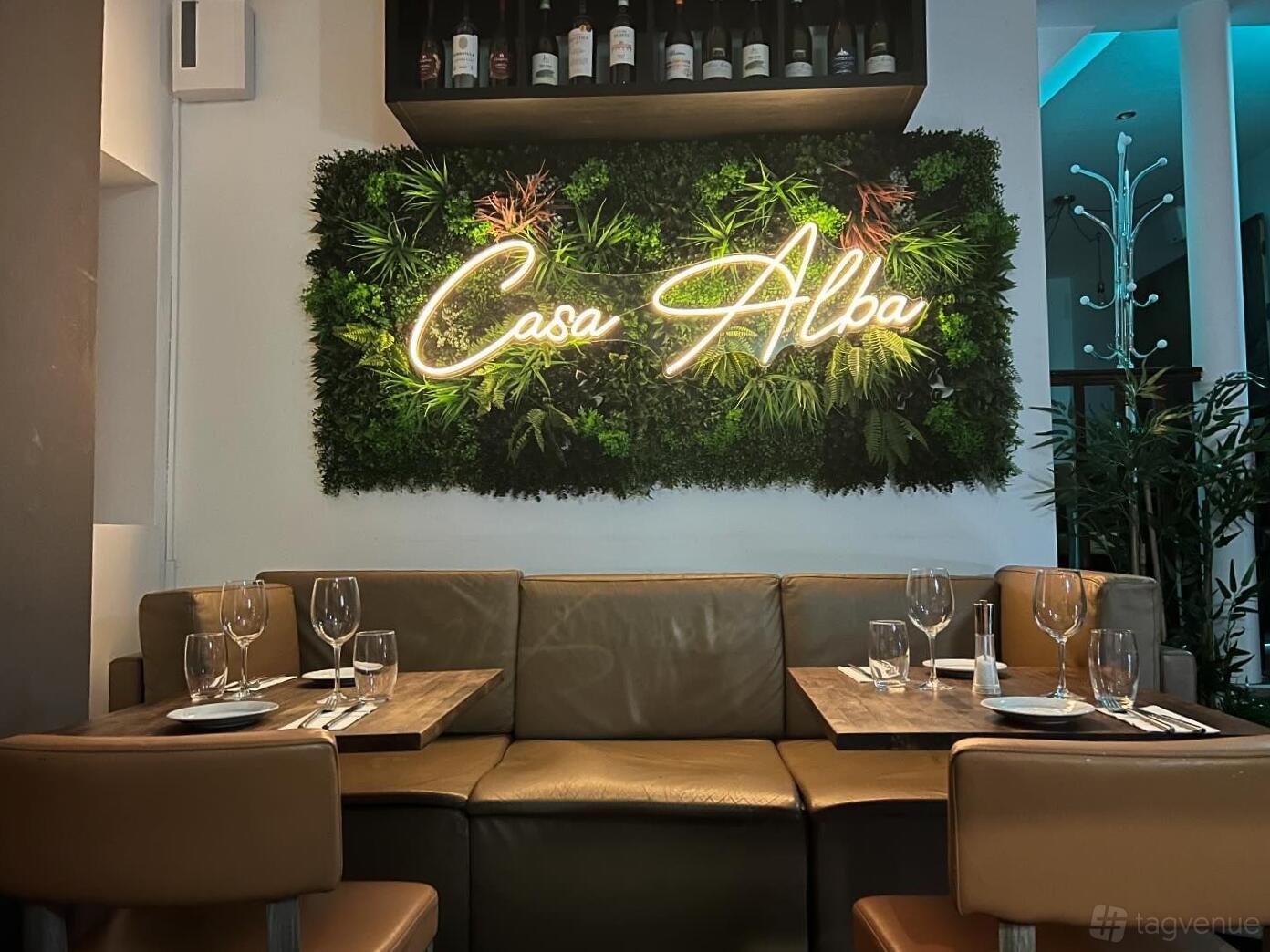 Casa Alba is a cozy Italian restaurant located on 74-76 Otley Rd in Leeds. The space is warm and welcoming, with elegant decor featuring greenery on the walls and soft lighting. The seating includes comfortable chairs and booths, perfect for a relaxed dining experience. The restaurant can host up to 100 people. The simple yet stylish decor creates a cozy atmosphere that makes guests feel right at home.