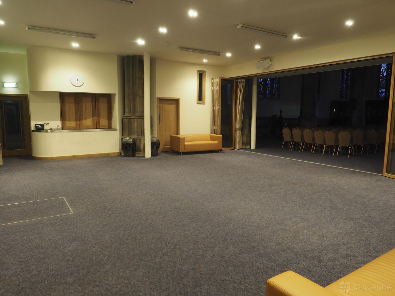 The smallest of our three rooms, this room can seat up to 60 people. It can be used as a welcome and break-out room in conjunction with the main hall or as a separate space. It is often used as a cafe area and there is a serving hatch linking the room with the adjoining kitchen. It also has a PA system and flat screen TV that can be linked to a laptop to display images or run video.