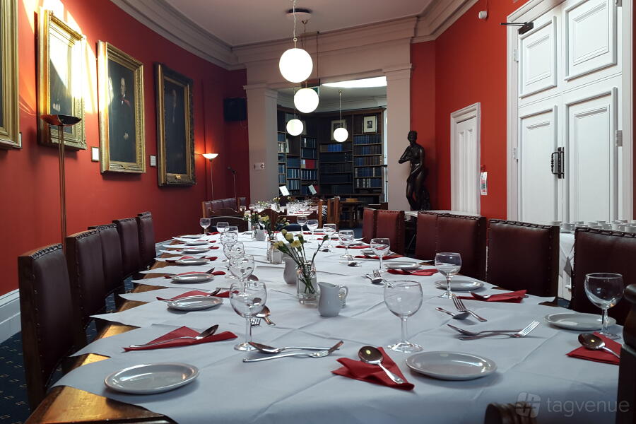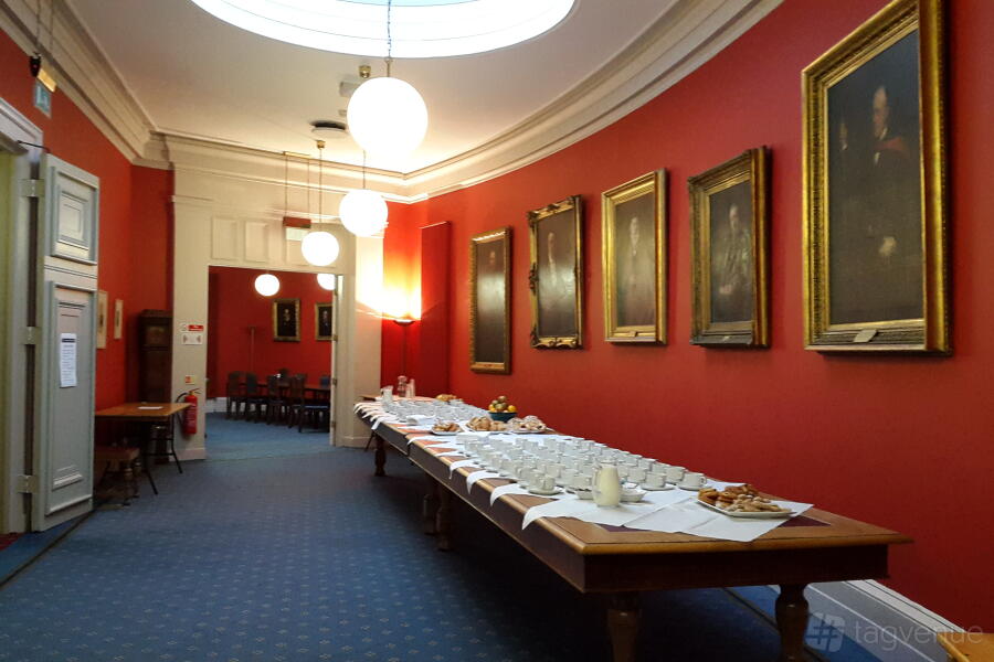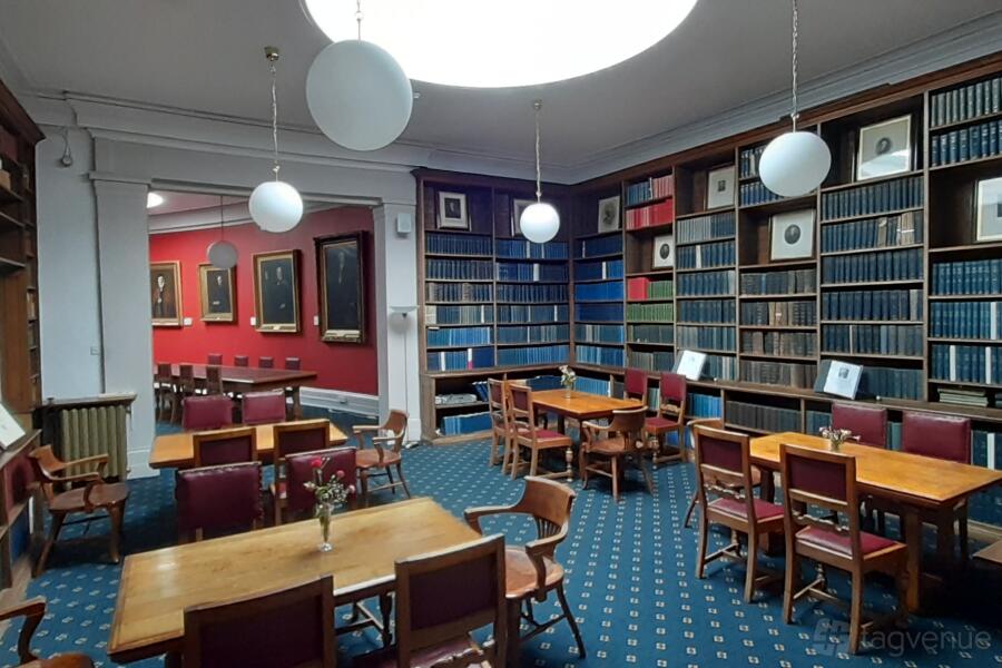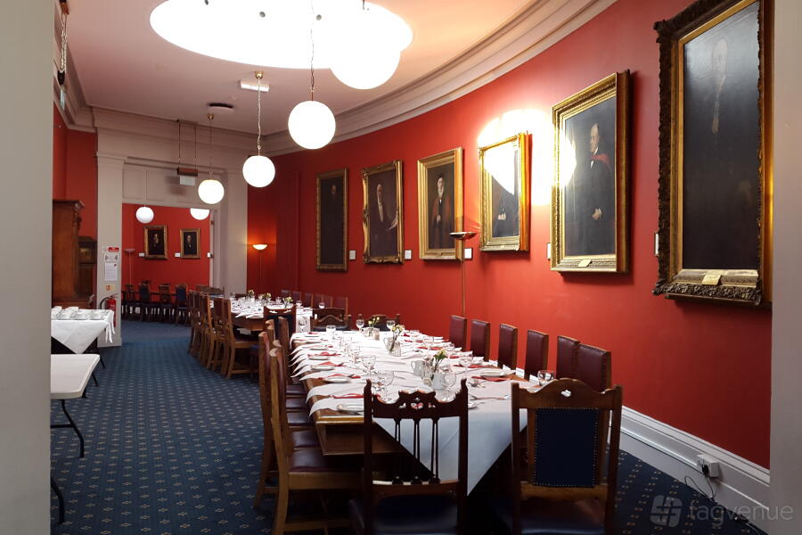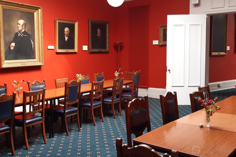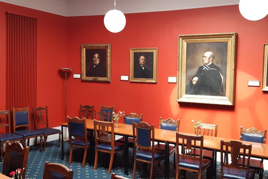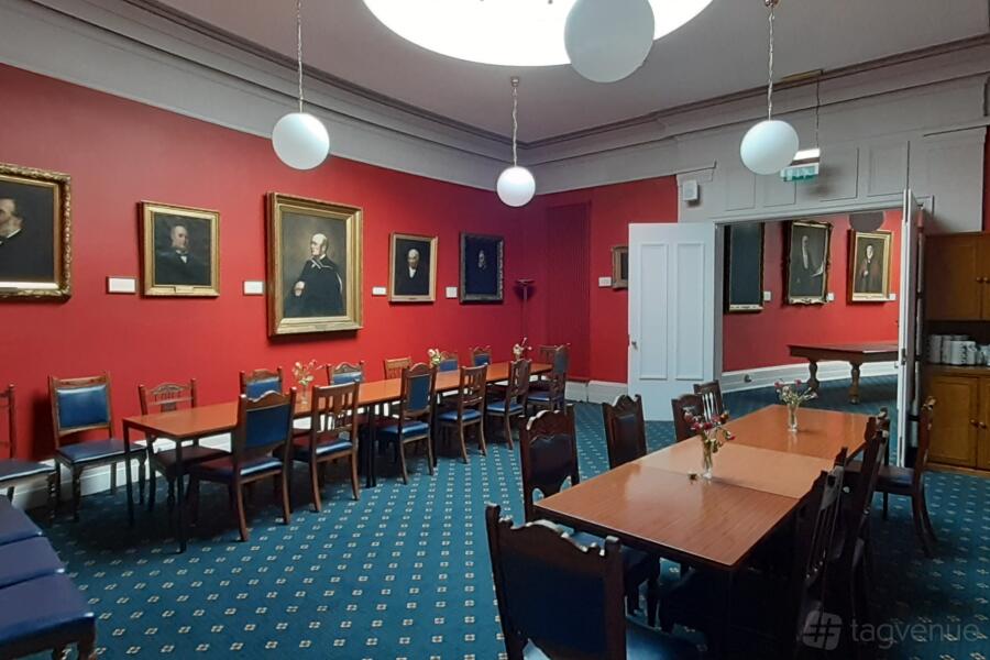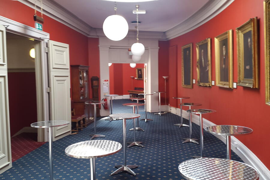 The room dates from 1837 and features several large antique portraits, pitch pine panelling, and an elegant large glass ceiling dome.