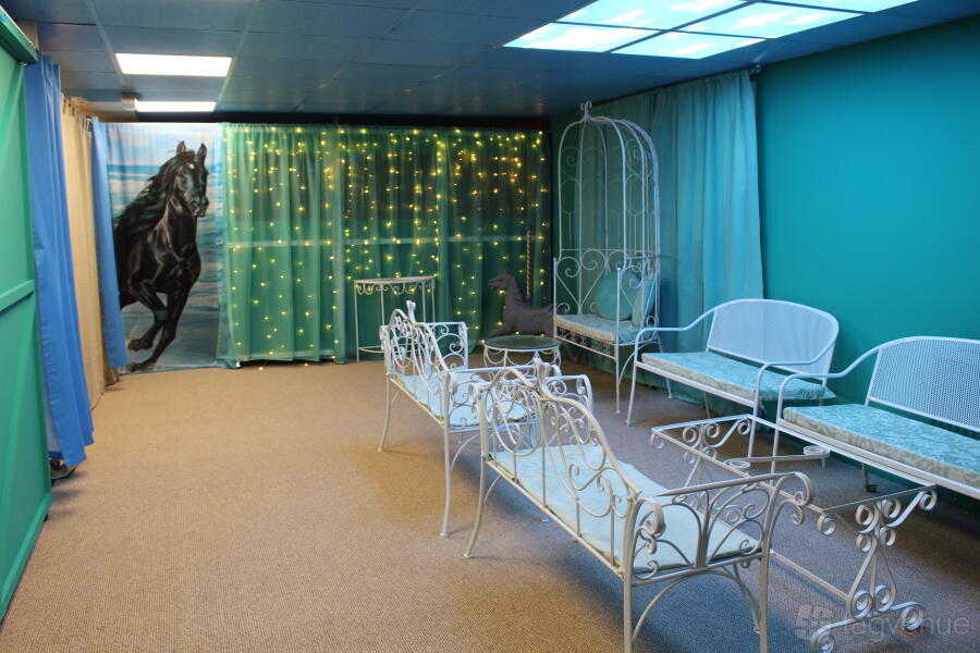 In a room without any windows we wanted to create an airy flow of energy with some visual effects. Wild horses running on the beach came as a natural choice. A sky roof lighting, white metal benches and mini tables, wind chimes and sandy carpet will enhance some energy for those feeling free as the air.