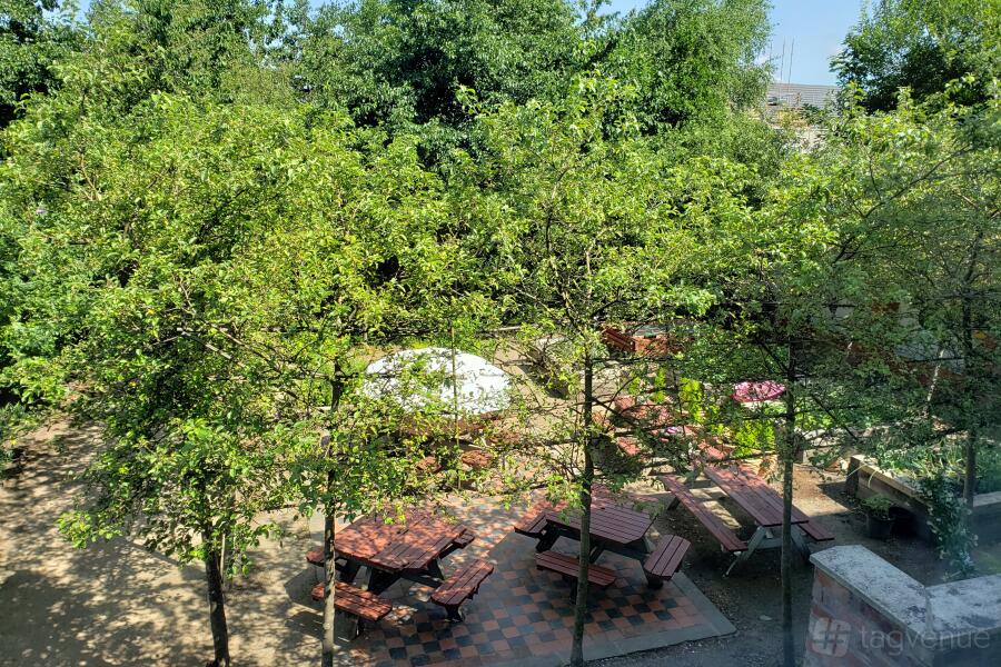The room has 4 Georgian windows and high ceiling which make the space feel fresh, airy and bright. There is no fixed furniture so it can be arranged as a seated workspace , or an informal gathering for talks and events. It can accommodate 20-40 people.