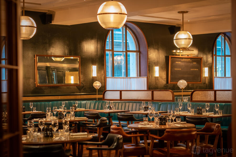 The 165-cover restaurant and 30-cover bar was inspired by the grand optimism of the roaring twenties and celebrates this legacy by highlighting original fittings and sourcing antique finds from the same era, like antique street lamps that once lined the boulevards of 1920s Paris, now reclaimed into glamorous brass-trimmed ceiling lights. The use of reclaimed materials, a Hawksmoor signature, continues throughout the restaurant with brass and mirror inserts on the walls, warm timber floors and brass and wood-topped tables reclaimed from chemistry labs.