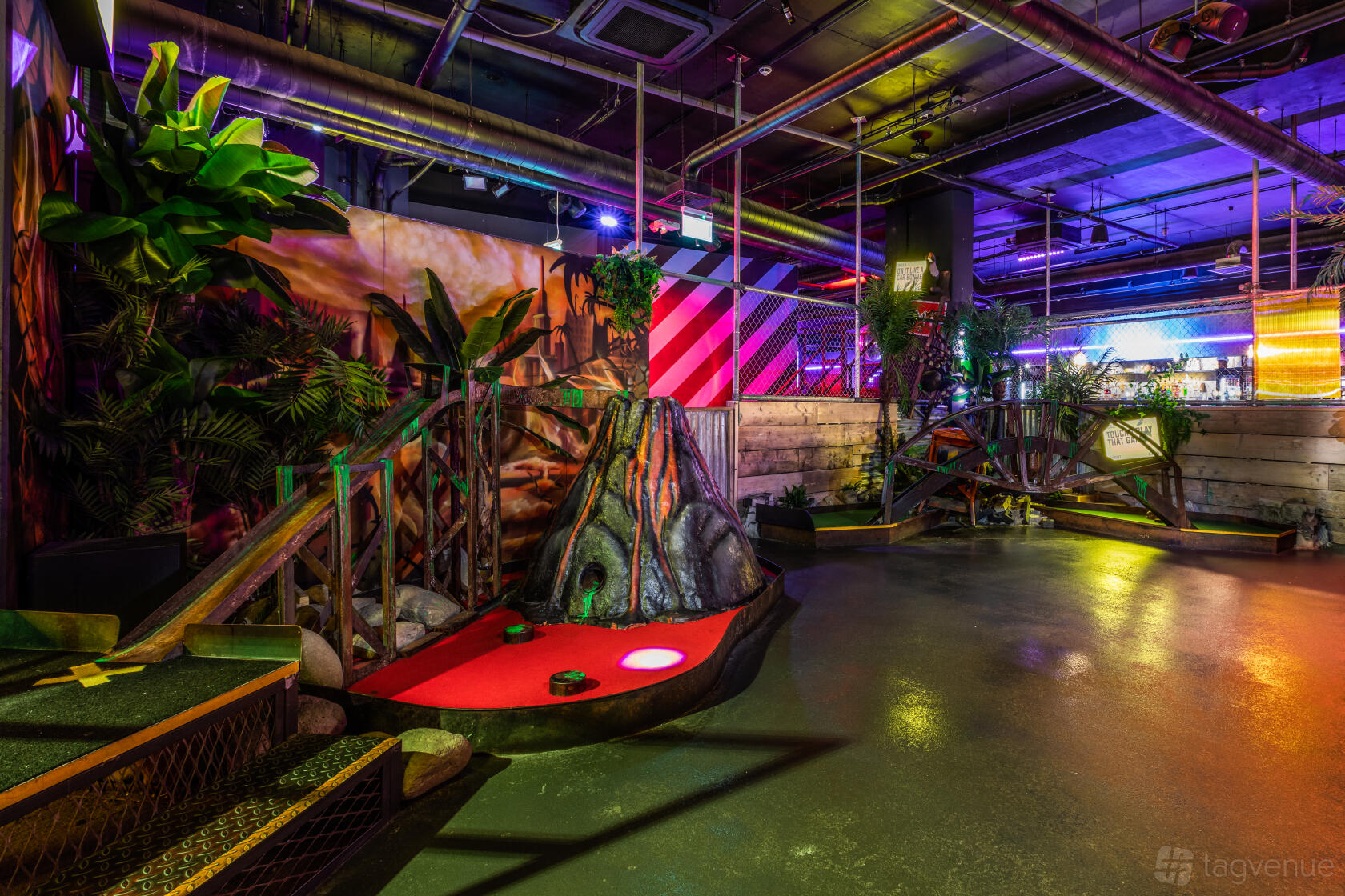 It boasts a playful atmosphere filled with neon lights, odd props, and a party-like vibe, perfect for both small gatherings and large-scale events.