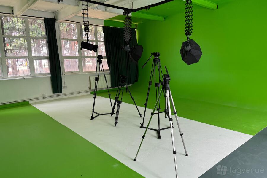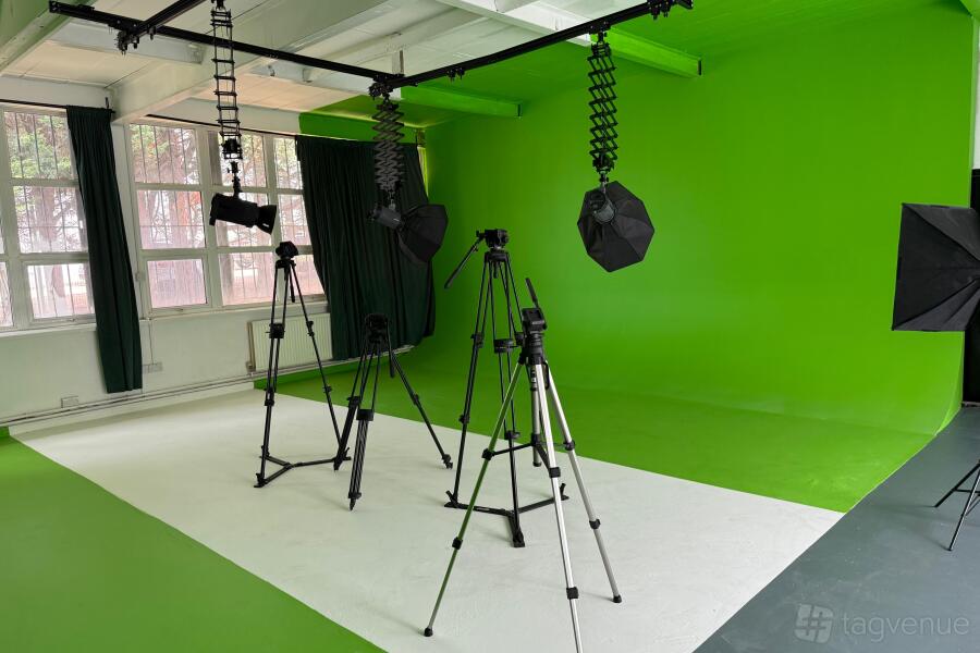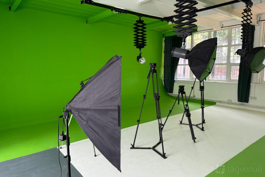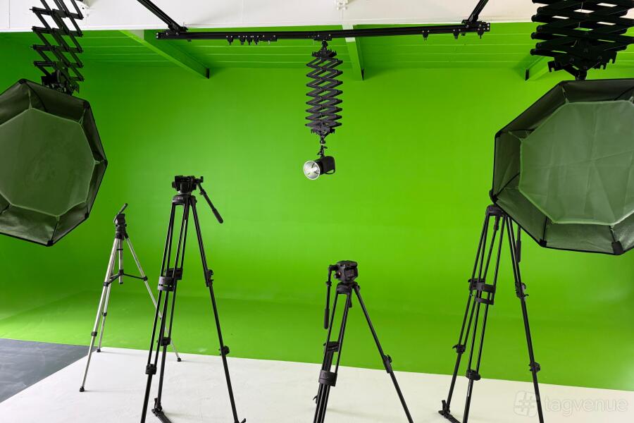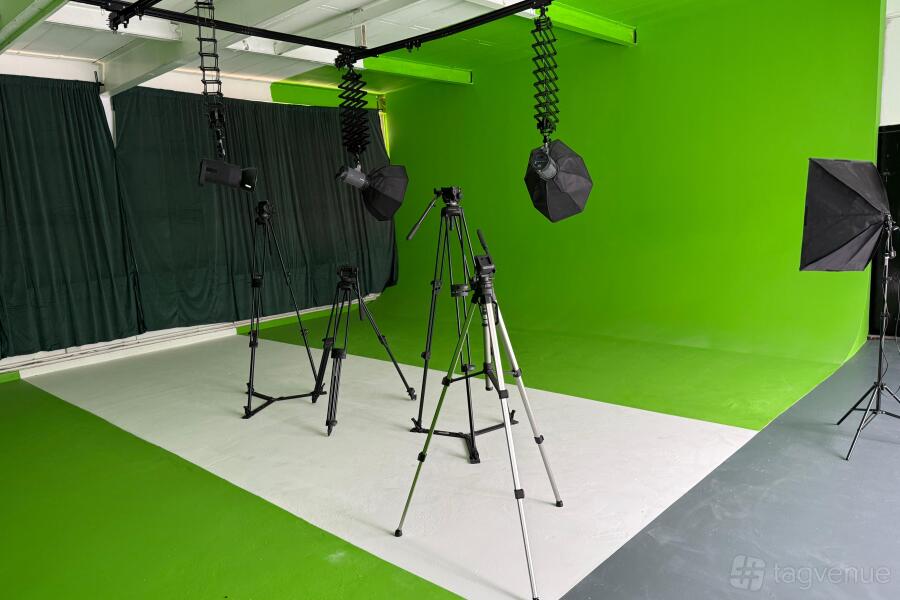A green screen video suite also with an infinity cove, perfect for filming, CGI, YouTube, Reels, and promos.