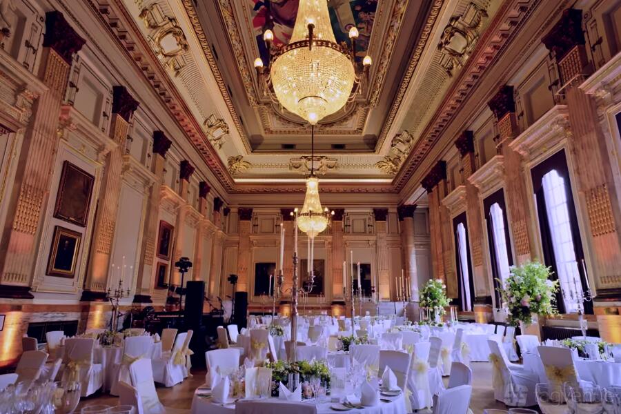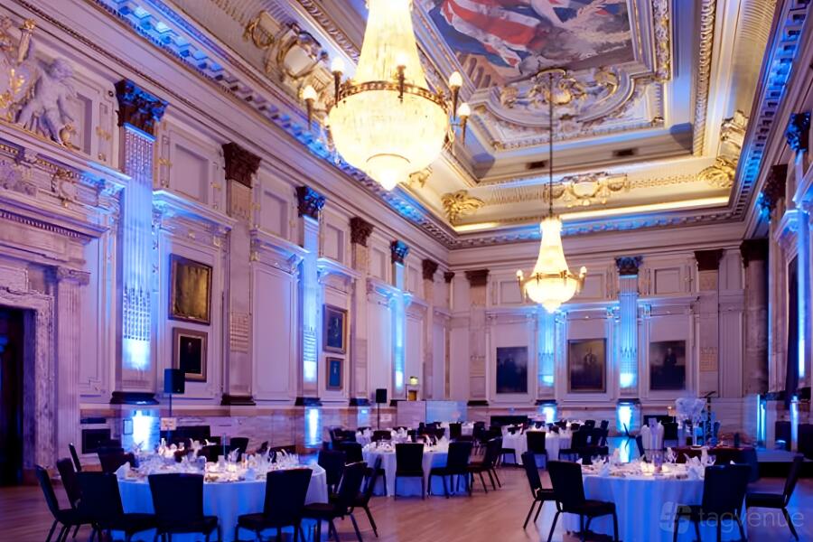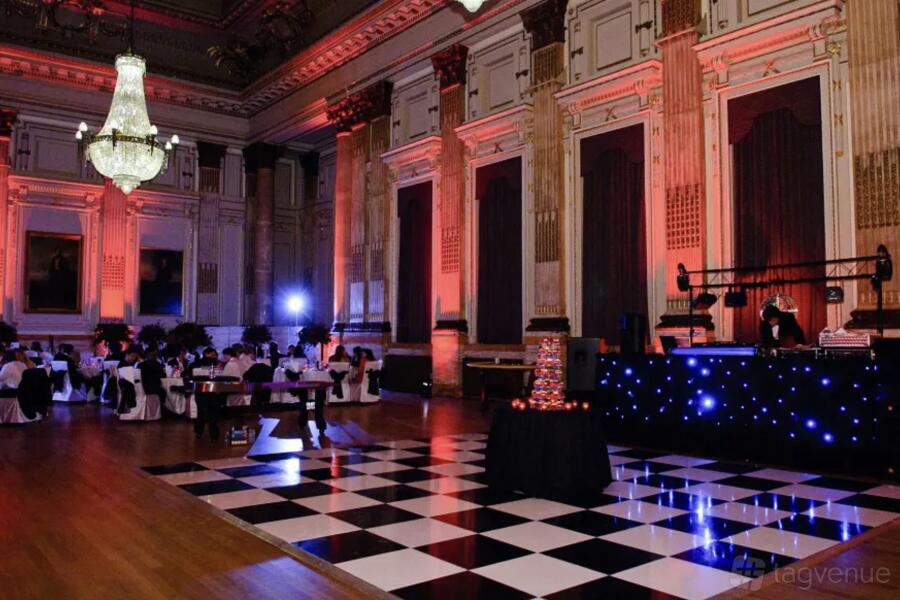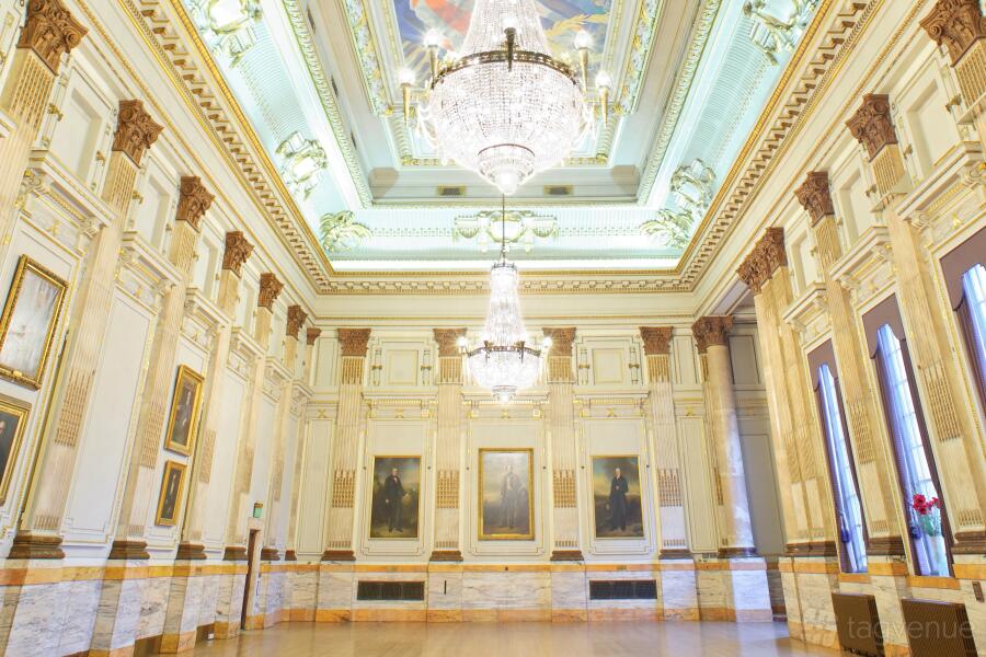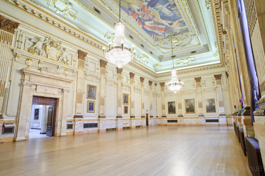 This impressive event space has high ceilings and large windows along the west wall allowing in lots of natural daylight. The walls are covered with rich, dark French walnut paneling and the ceilings adorned by beautifully embellished plaster and lit by a large chandelier. The soft furnishings including recently-added curtains and carpets are well-appointed in reds, greens, and golds which help create a warm, luxurious feel.
