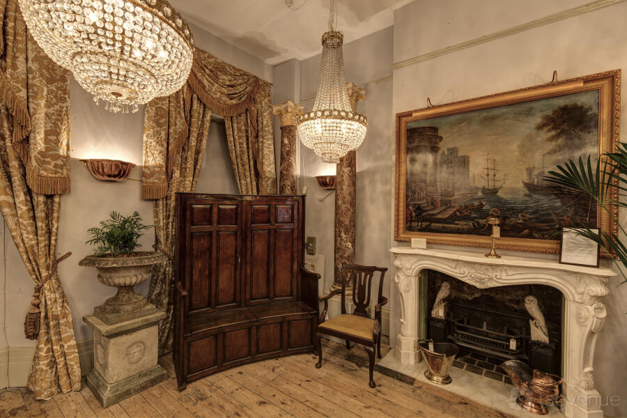 Inside its lofty Georgian interior the panelled rooms are packed with salvaged curiosities, magnificent chimneypieces, brilliant cut glass entranceways, sparkling chandeliers and noble colonnades.