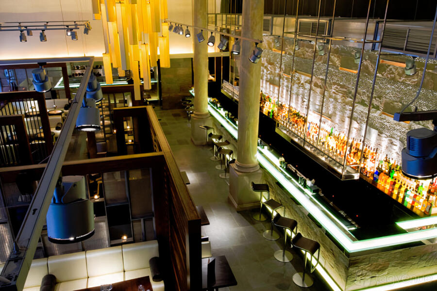 The striking cocktail bar and mezzanine level are backed by captivating light features, long translucent drapes, snake-skin booths and comfy sofas which make this a sumptuous retreat for the discerning guest.