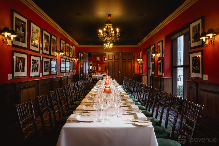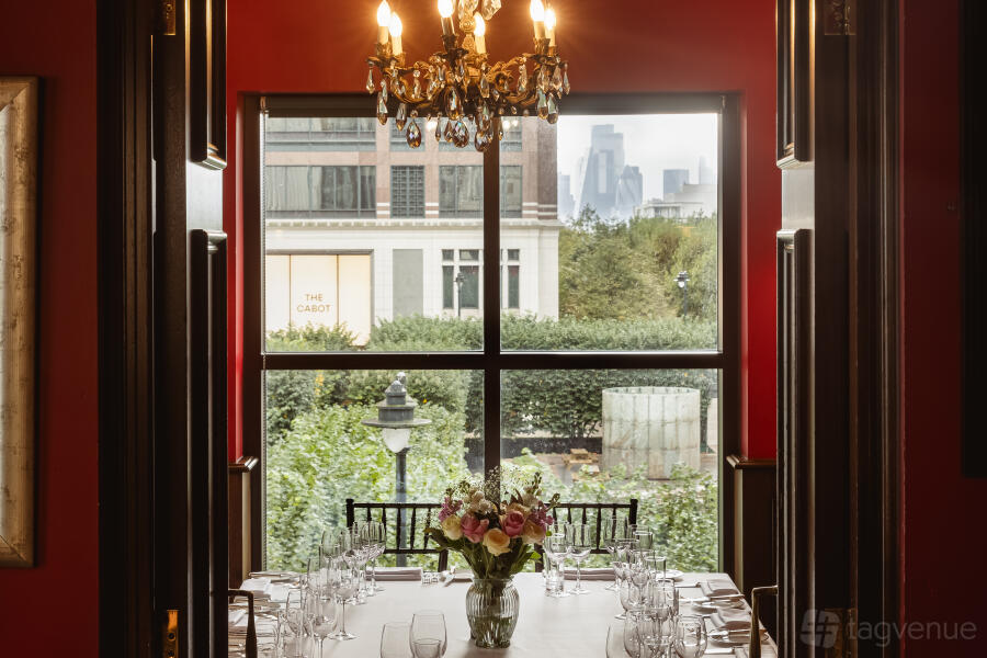 Set on the second floor of a Gotham City style Art Deco building overlooking the fountains in Cabot Square with a view of the City of London skyline, the restaurant bears the distinctive Boisdale design of lacquer red and dark green walls, rich mahogany panelling, with an eclectic collection of the classical and modern original artwork.