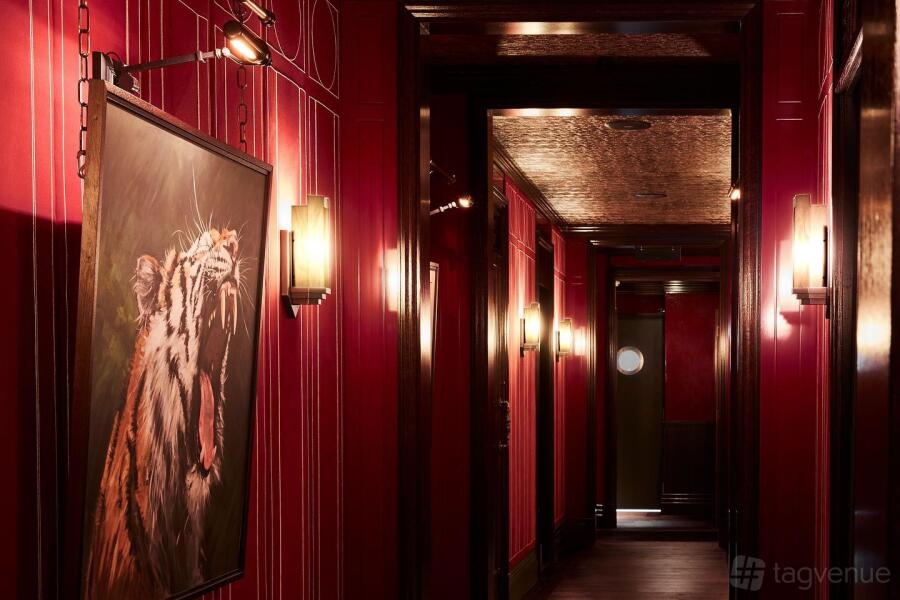 The Pool Room is inspired by the art deco stream-liners of the 1920’s and is cladded in polished black and chrome façades, complete with a leopard print carpet.