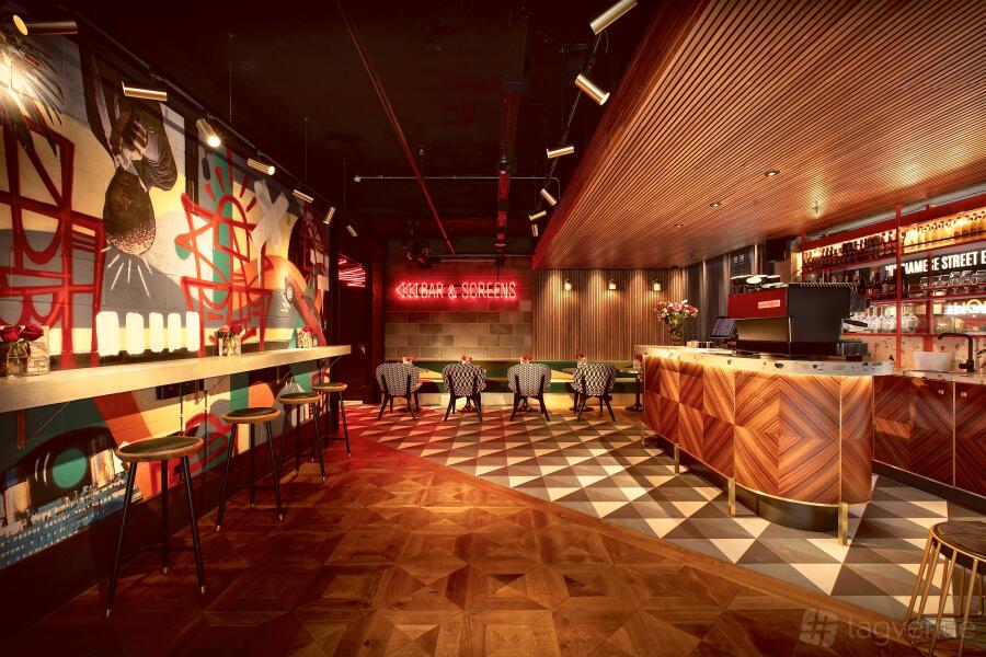 Upon entering Everyman Broadgate, guests are greeted with the cafe bar where seating surrounds a beautifully crafted, freestanding bar which is flanked by a hand painted movie-inspired image on the left wall. Here guests can grab a drink or head straight on down to the lounge, bar and screens at the lower level.