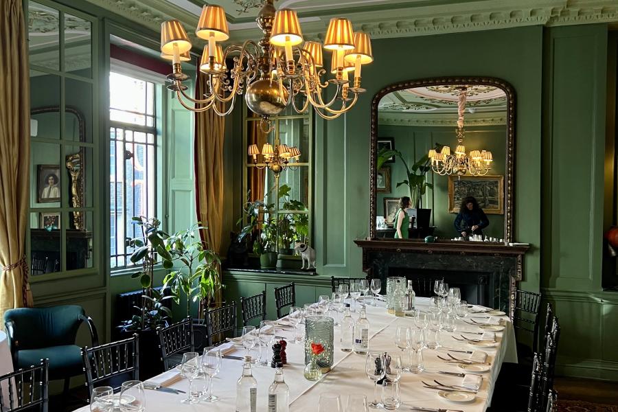 Le Salon Vert is the most elegant and enchanting room, with 16th-century gold encrusted ceiling and mirror, look below to the streets of Soho with a glass of our Laurent Perrier Champagne in hand.