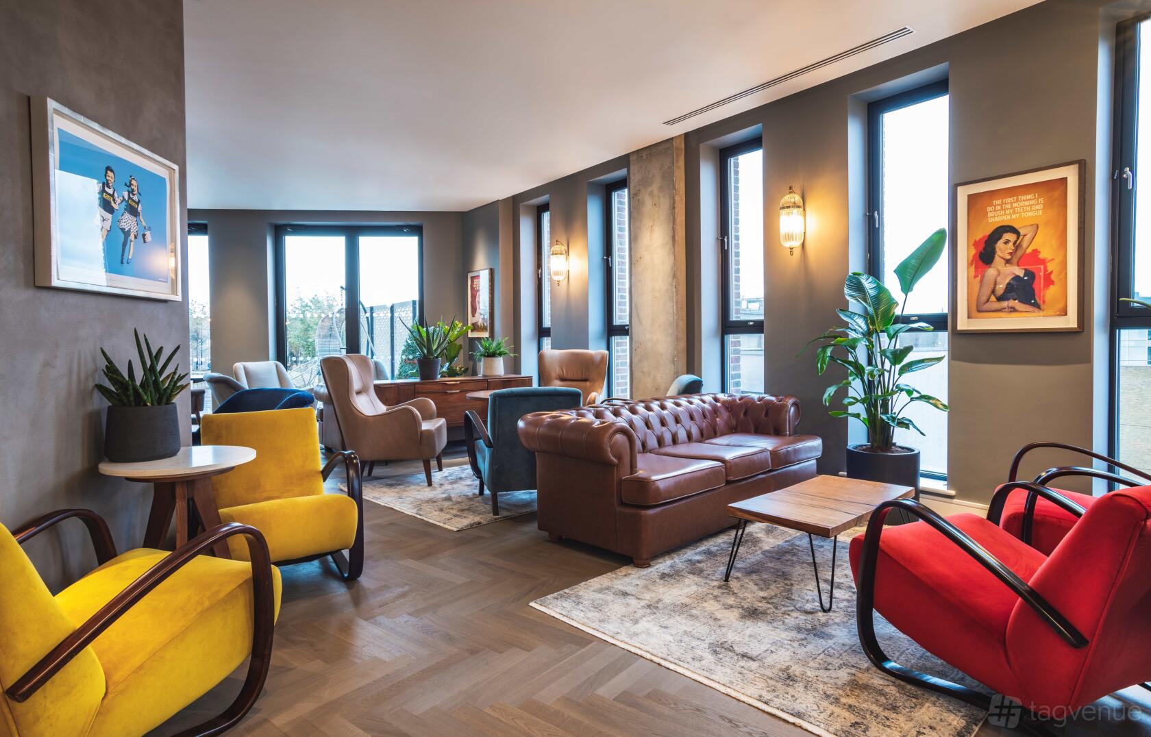 On the fifth floor, The Lounge brings together the hotel’s boutique atmosphere with an eclectic East London flare, furnished with beautiful original and new Mid-Century furniture and art curated by Maddox Gallery.