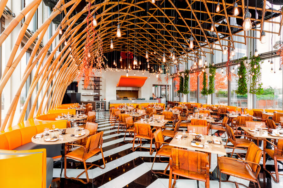 As the largest space within SUSHISAMBA Heron Tower, the main dining room features a double-height ceiling with distinctive