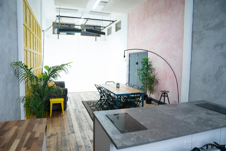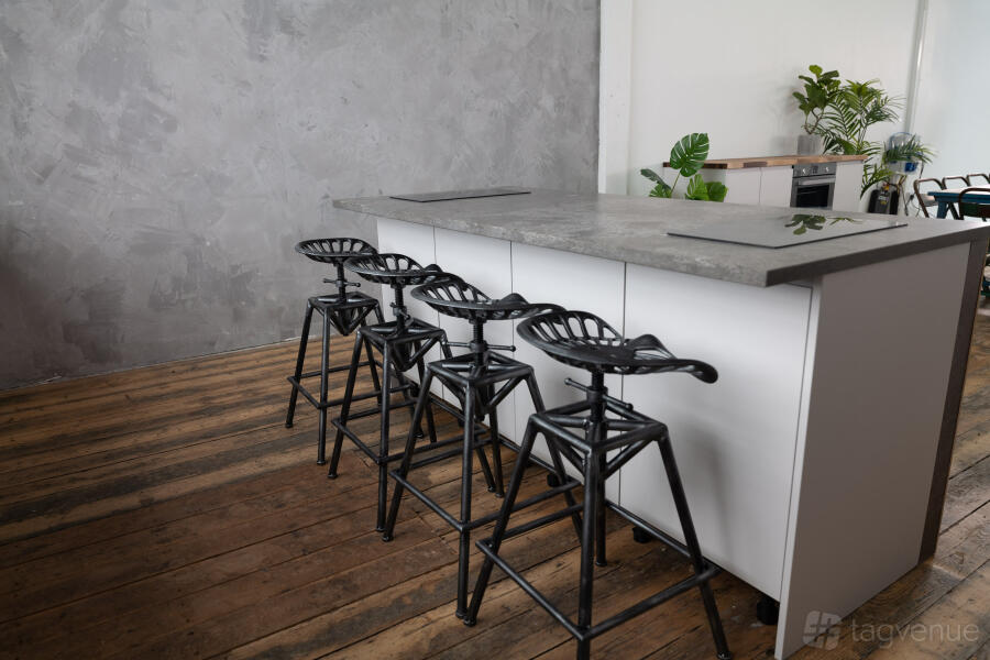 At one end of the studio, a fully functional rustic kitchen is perfect for capturing food and cooking content, whilst the other end, a warehouse lounge/dining area is a great space to film interviews, or to use as a breakout area.