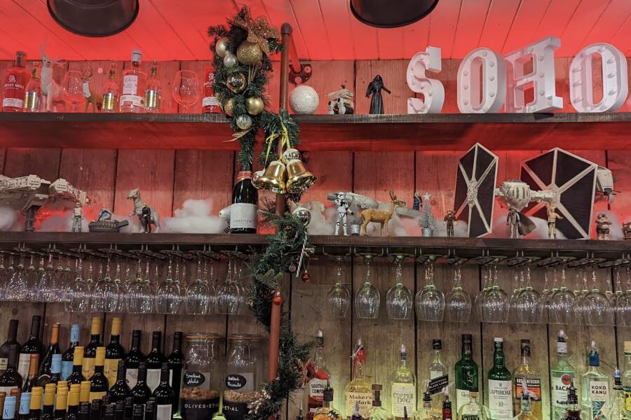 An ocean-coloured private bar with plants, leather chairs, exposed bricks, and ceiling art. Perfect for parties, meetings, or weddings with buffet or sit-down meal options.