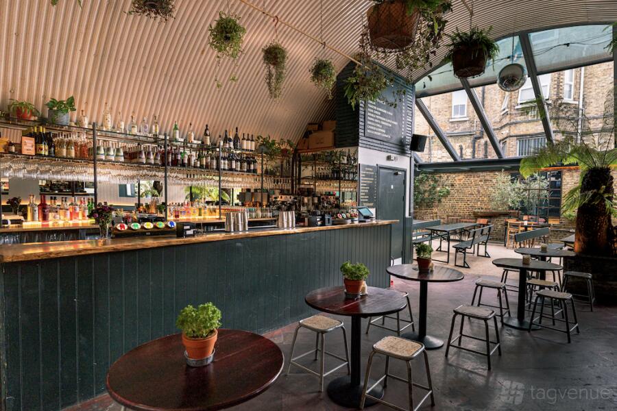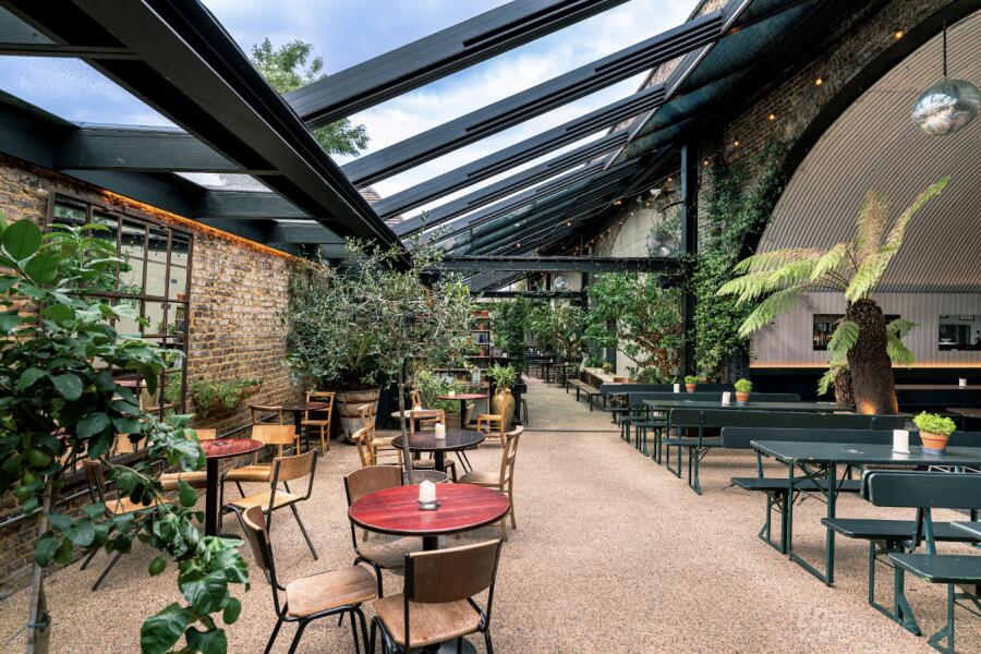 A beautiful large garden courtyard surrounded by plants with a fully retractable glass roof, allowing guests to bask in the sun on sunny days, and stay warm and dry in the winter months. The terrace is perfect for gatherings of up to 150 people, and can be blocked off to create a privatised space for any social event, summer party, summer social, Christmas party, xmas drinks, birthday party or corporate gathering. All events can be totally bespoke with the option to have food and drink tailored to suit your specific needs. The space also has DJ decks, a pool table, board games, and TV screens, a PA system and microphone.