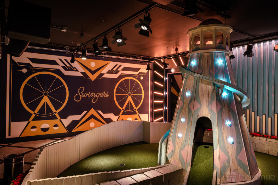 Swingers West End takes crazy golf back to its seaside roots in a venue that reimagines the faded glamour of the 1920s English Riviera.