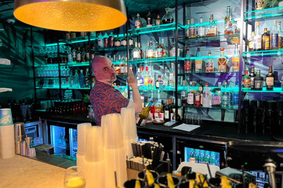 A visually striking cocktail lounge that blends bold colour with tropical retro flair, this space is built around a glowing striped-front bar backed by mirrored shelving that amplifies light and atmosphere.