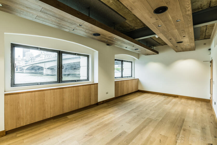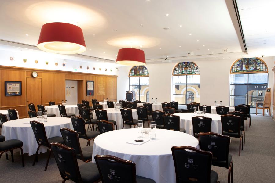 With floor to ceiling windows offering unrivaled views of the Thames and City of London the River Room is a versatile and flexible space for conferences, meetings, AGM's, training, seminars, workshops, receptions and dinners for up to 180 guests. As with all spaces at Glaziers Hall there are excellent audio-visual facilities and lighting options to enhance your corporate branding. The adjoining first floor foyer, complete with an original map of London from 1746 can be used for registration.