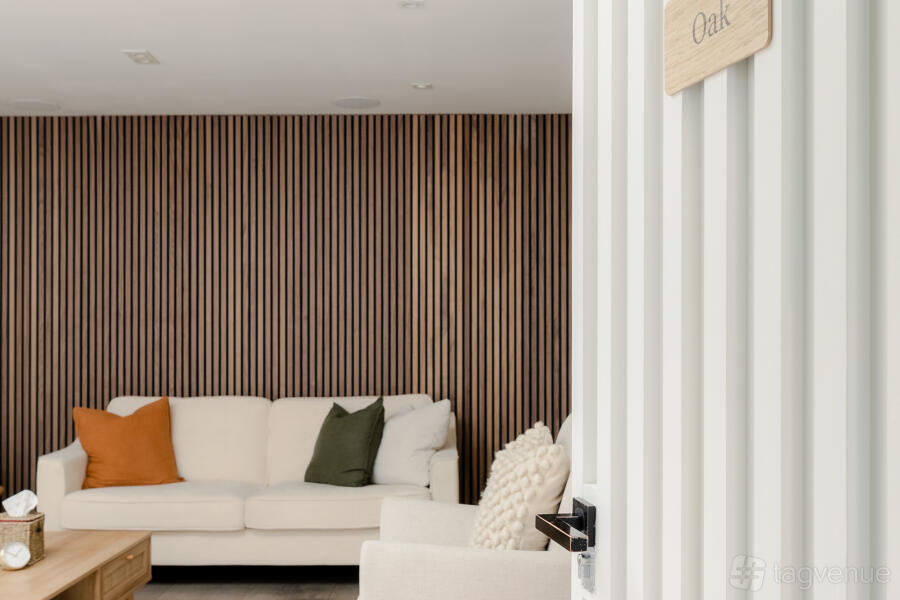 We have seven rooms available, ranging from a small and intimate two-person room to a large group therapy and events space suitable for up to 9 people, along with two recovery pods in the basement where guests can go for a few moments of rest and relaxation before going back out into the world.