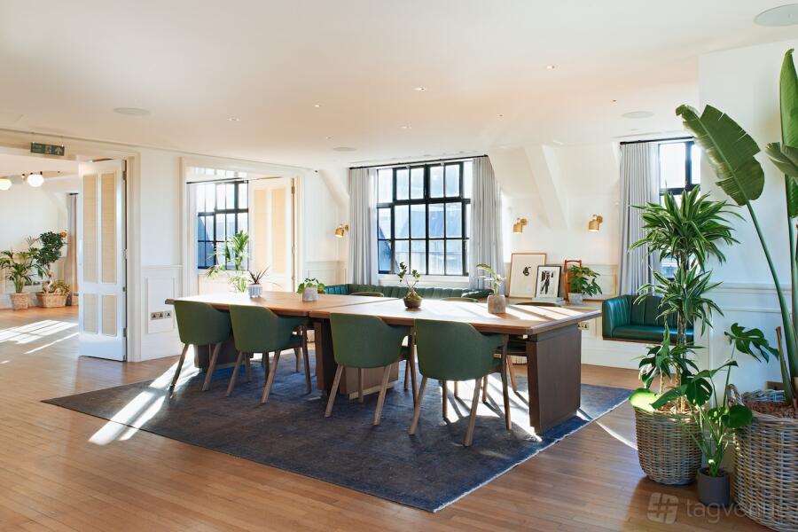 Additionally, power sockets are conveniently tucked away around the central table, ensuring easy access and connectivity for attendees.