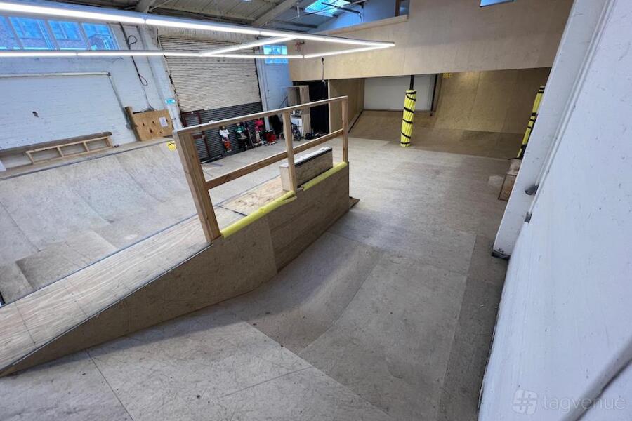 The total space is circa 1925sqft. The ground floor (1625sqft) is a skatepark with a 16ft wide mini ramp, which forms a natural staging area, with wallride under the mezzanine which doubles as an infinity wall for photoshoots. There is projector for showing film and makes a great cinema.