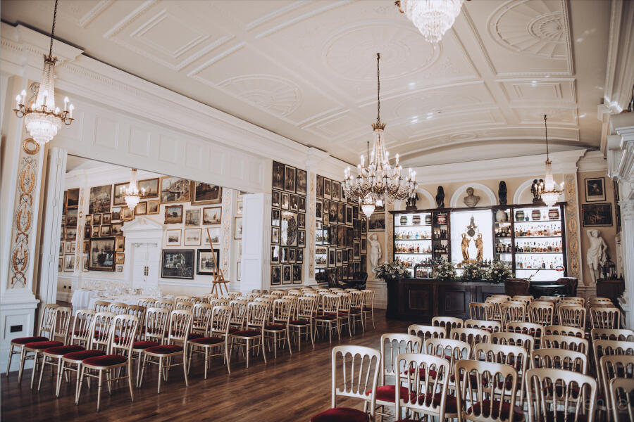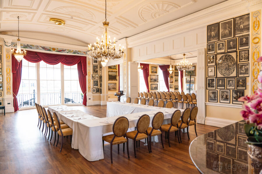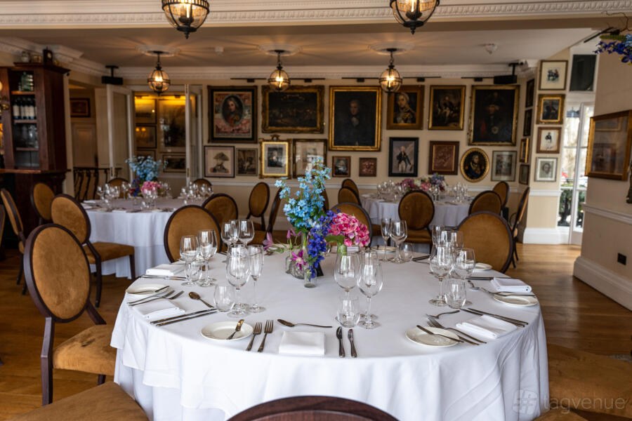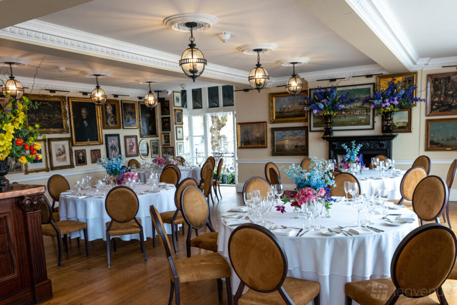 With floor to ceiling bay windows - complete with ornate regency style balconies – and double heighted ceilings, The Nelson Room is in no shortage of natural light. Ornate cornicing decorates the space, whilst the walls are lined with 19th century artwork depicting Greenwich, and indeed the Tavern itself, across the last 300 years. In the Nelson Room, the sheer history of the venue is palpable and an immediate talking point for anyone entering the space.