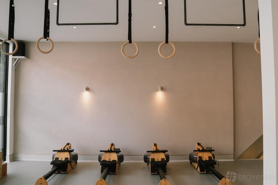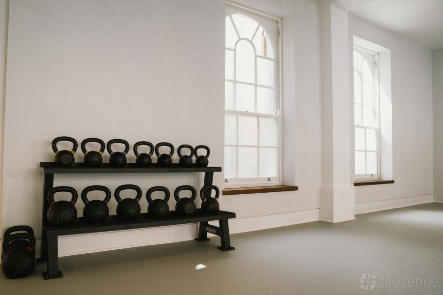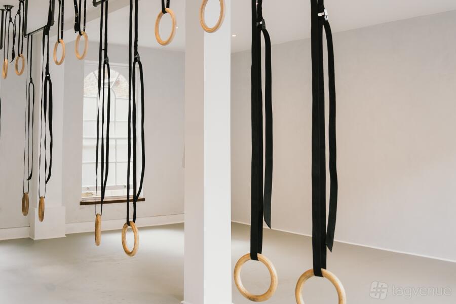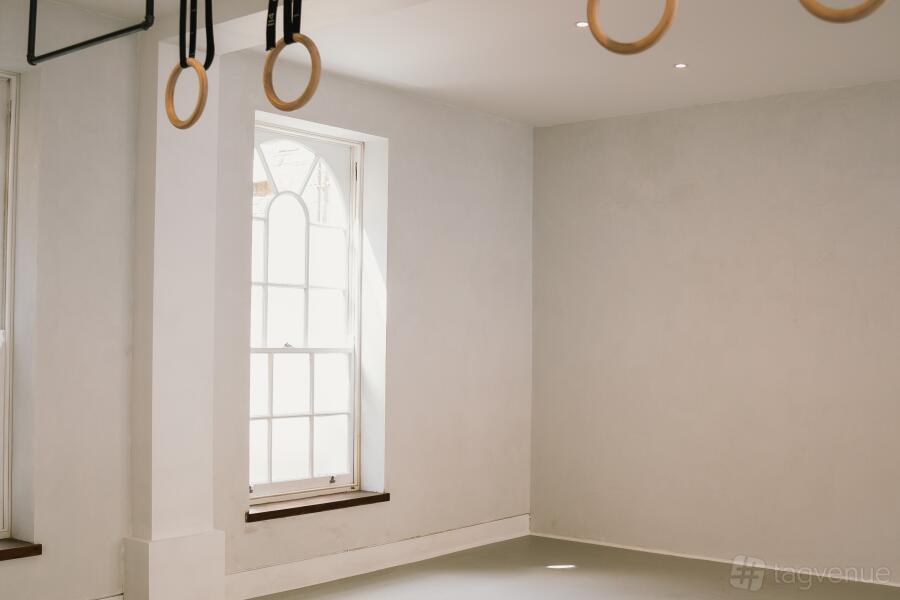 The ground floor is an open-plan gym space with lots of natural light, open space and textured walls. We also have gymnastic rings, pull-up bars, kettlebells, yoga mats, yoga blocks and water-rowers.