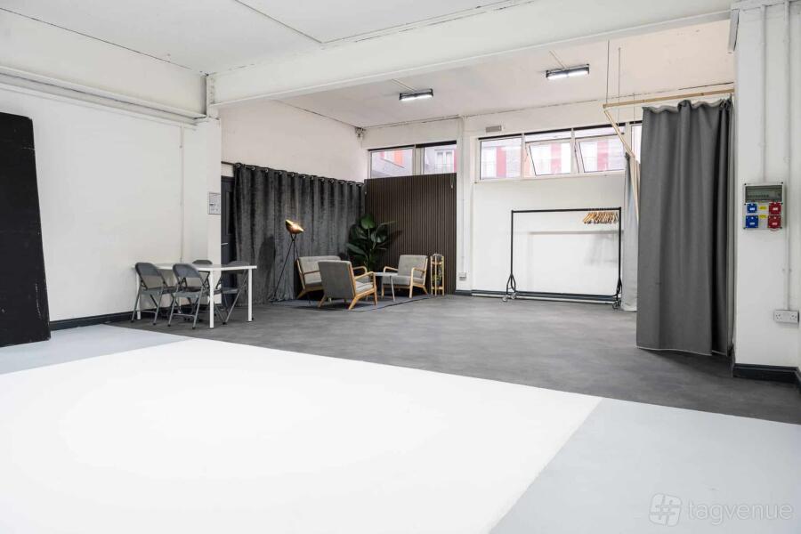 The studio is 1400sq ft big and the layout is open plan. This leaves freedom to setup the space in different ways. It's a very quiet space that is ideal for filming and for photo shoots. Many types of events can be organised here thanks to it's large space and white looks.