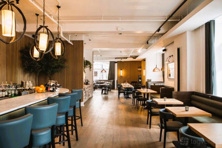 The shared space just in front of the bar is ideal for welcoming groups of up to 30 people. Guests can stand at the bar in a relaxed atmosphere for having a drink prior to sitting down for lunch or dinner.