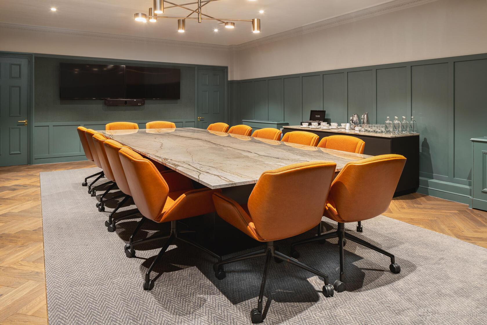 The Boardroom in this historic building is a contrast of original period features and contemporary style furnishings. The room is spacious, elegant and ideal for large groups or presentations. It seats up to 14 people, it is located on the ground floor and is furnished to a high specification