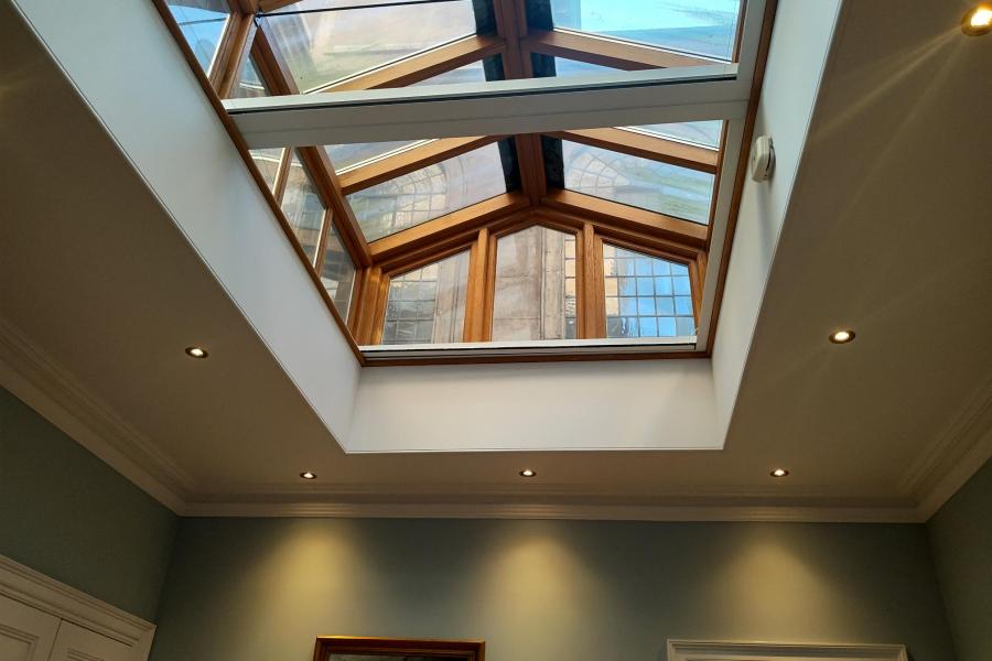 A newly renovated, large versatile meeting room, flooded with natural light from the large roof light and window.