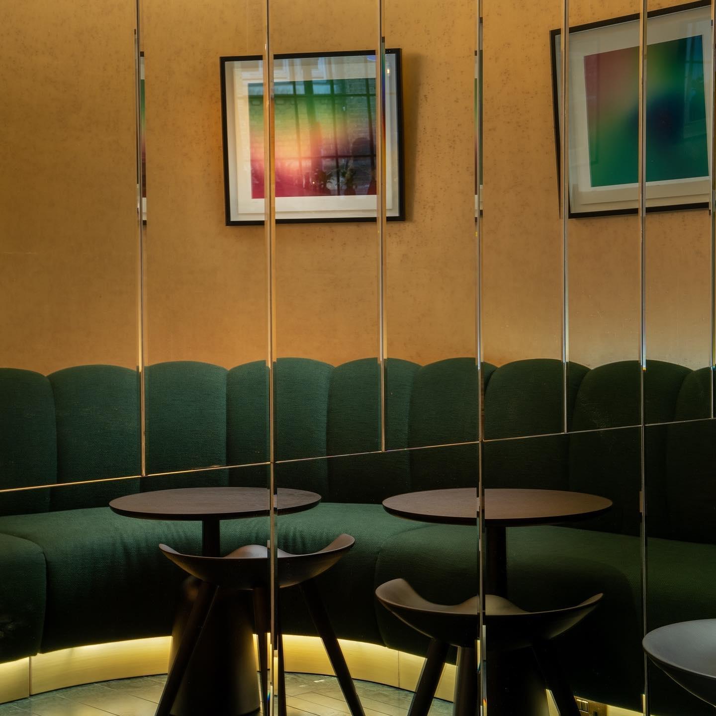 The ground-floor cocktail room is centered around the main bar and boasts a luxurious color scheme of dark green and bright gold, which imparts an almost regal feel to the space. This inviting room is equipped with cozy banquettes perfect for intimate conversations. It can comfortably accommodate up to 25 seated guests or up to 40 guests standing, making it an ideal venue for both small gatherings and lively events.