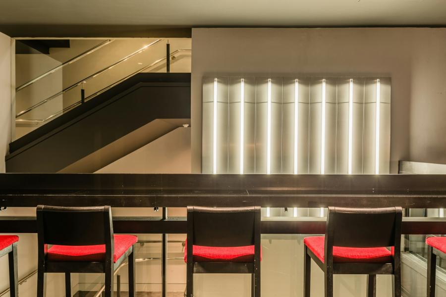 Welcome to Curzon Soho Bar Area, a vibrant cornerstone of urban culture and casual sophistication. Nestled within the heart of the city, our bar is a sanctuary for cinephiles and casual patrons alike. As you step inside, you're greeted by the warm embrace of dim, ambient lighting that perfectly balances the natural daylight streaming through the expansive windows. This creates an inviting glow that illuminates the sleek, dark-toned furnishings and the bold red accents that give life to the space.