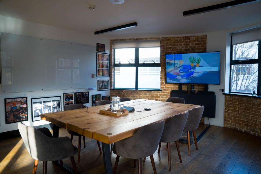 Welcome to our cozy retreat, the 6-person log cabin meeting room, tucked away from the hustle and bustle of the office. As you step inside, you're enveloped by the warmth and rustic charm of the space, with wood-paneled walls that exude a sense of tranquility and privacy.