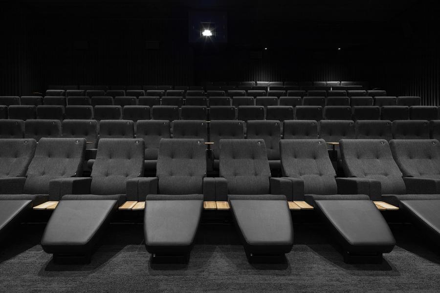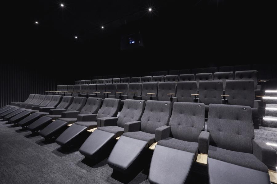 Screen 3 exudes an understated elegance with its minimalist design, inviting movie-goers into a world where modernity meets comfort. The theater is outfitted with luxurious, deep gray reclining seats that promise a relaxing viewing experience. Each seat is complemented by a chic, light wooden armrest, offering a stylish contrast against the dark tones of the room. The seating is meticulously arranged on a gentle incline, ensuring every guest enjoys a perfect view of the state-of-the-art screen.
