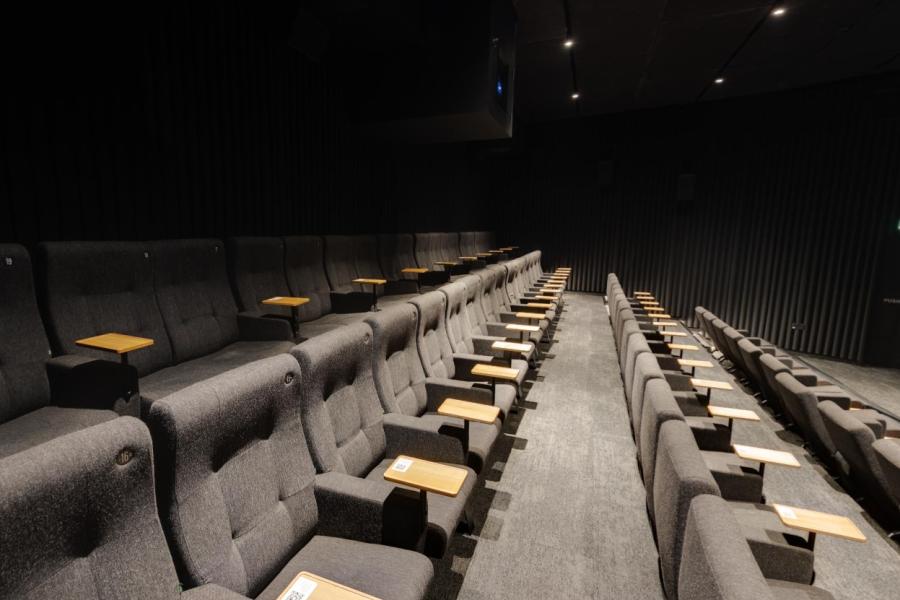 The walls are adorned with sleek, vertical acoustic panels that not only enhance the room's sophisticated aesthetic but also serve to create an optimal acoustic environment, providing an immersive sound that pulls you into the story. The strategically placed ceiling lights cast a soft, unobtrusive glow, further enhancing the intimate ambiance. Screen 3 is a sanctuary for film enthusiasts, where design and technology come together to create a truly unforgettable cinematic experience.