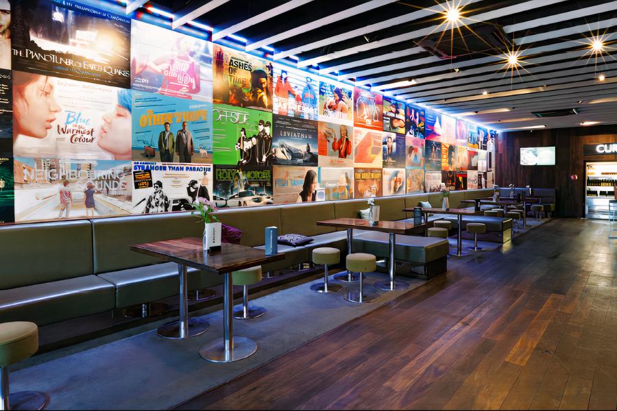 Architectural elegance is evident in the plush seating arrangements and refined décor, which create an inviting atmosphere for both the casual movie-goer and the discerning cinephile. The cafe and bar are thoughtfully zoned to transition from a daytime retreat for coffee aficionados to a vibrant evening spot where patrons can unwind with a glass of wine.