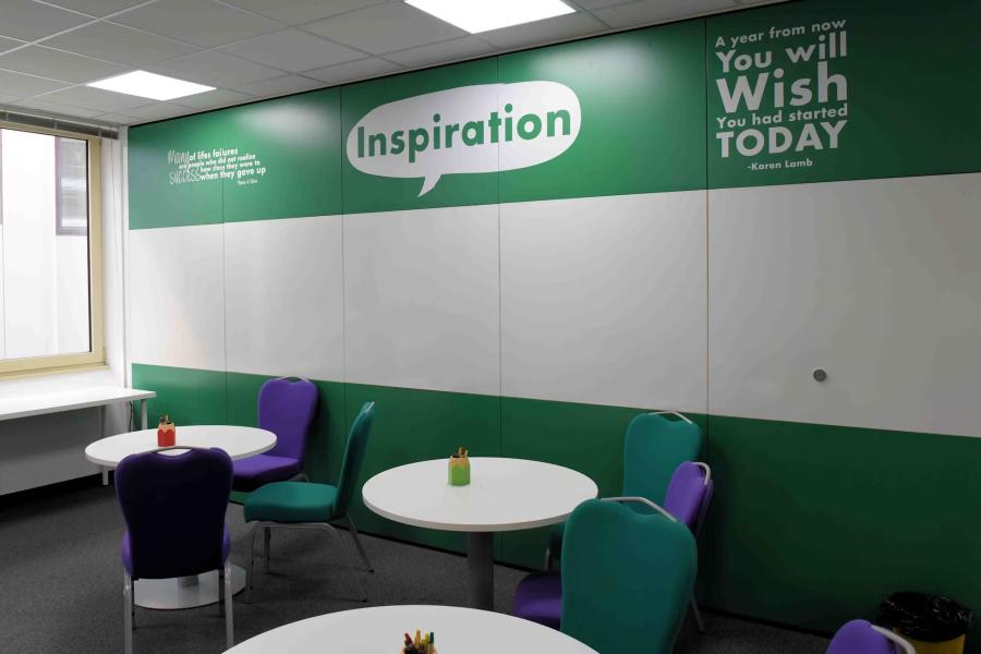 A large whiteboard and 1 whiteboard wall, giving you space for lots of annotation, brainstorming and interactive activities.