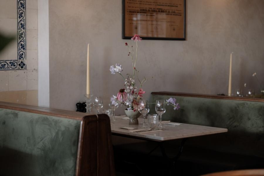 The new dining room unveils period features while touches of the original butchers shop can be glimpsed through unearthed wall tiles and meat hangers. The space is finished with beautifully designed wood, leather & velvet booths and marble tables. The reclaimed French doors lead you out to a small secret garden, with striking french stripped canopy, lush plants, sparkling fairy lights & heaters.