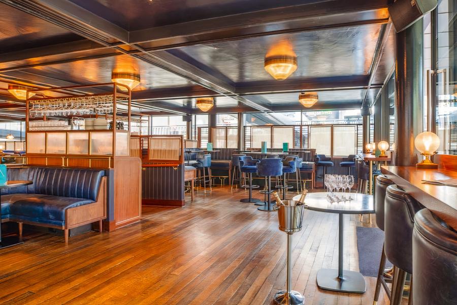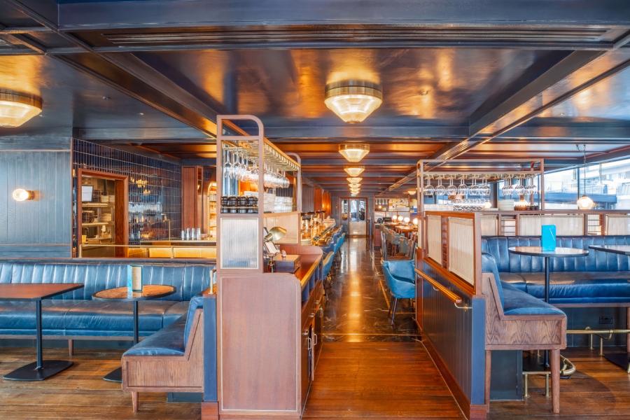 Hawksmoor Wood Wharf is housed in an eco-friendly floating pavilion in a new riverside neighbourhood in Canary Wharf. Gently rising and falling with the tide, the main restaurant at dock level is joined by a 120-seat waterside bar.