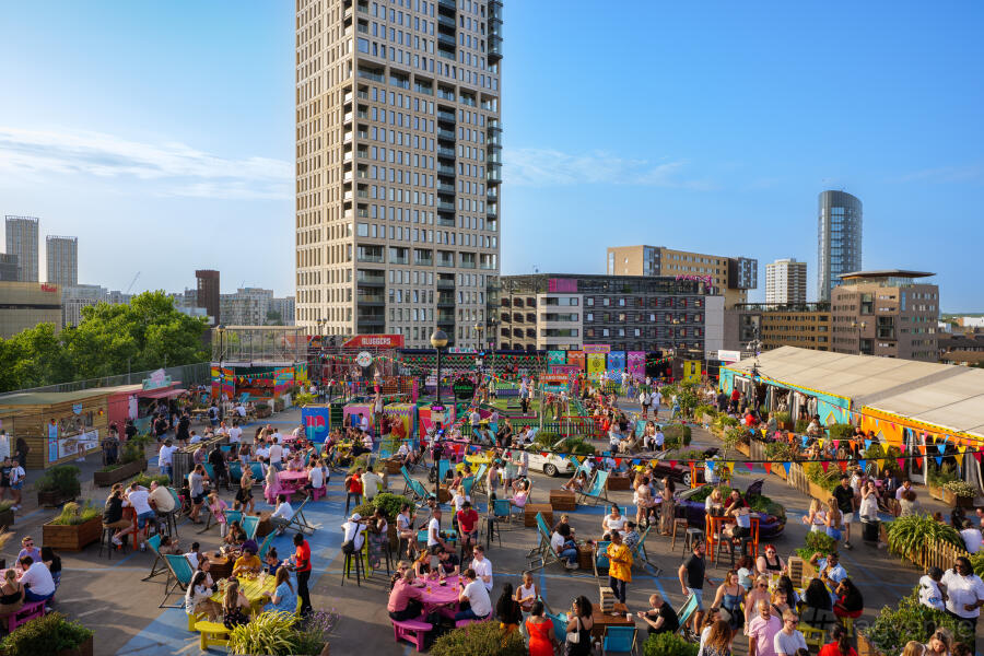 Roof East is an open-air rooftop bar with street food, interactive games, urban park and cinema space.