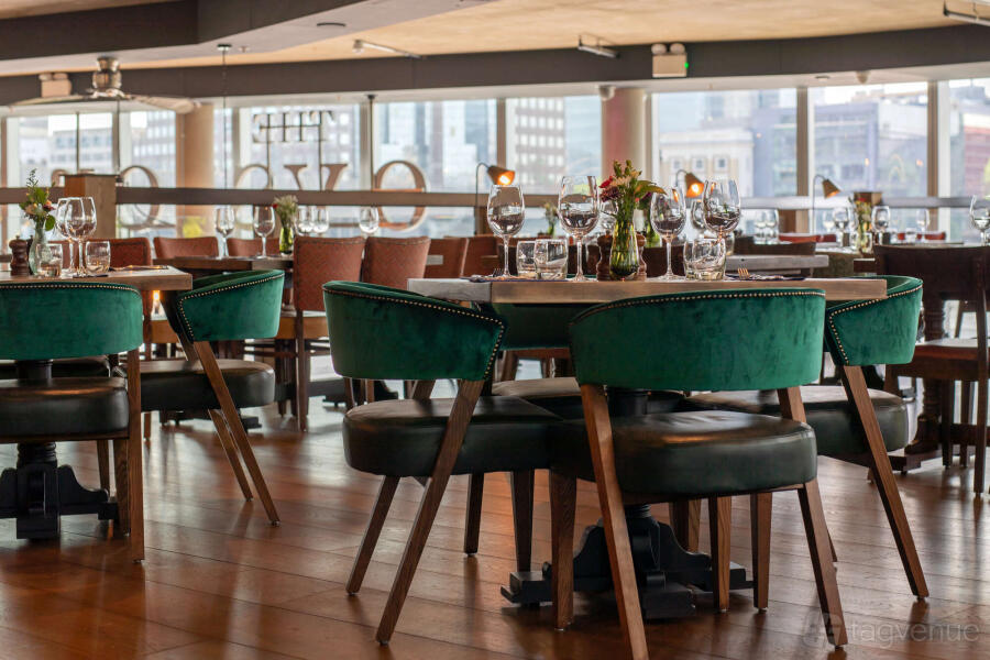 The Captain's Table sits on the first floor, featuring gorgeous large windows overlooking the river.
