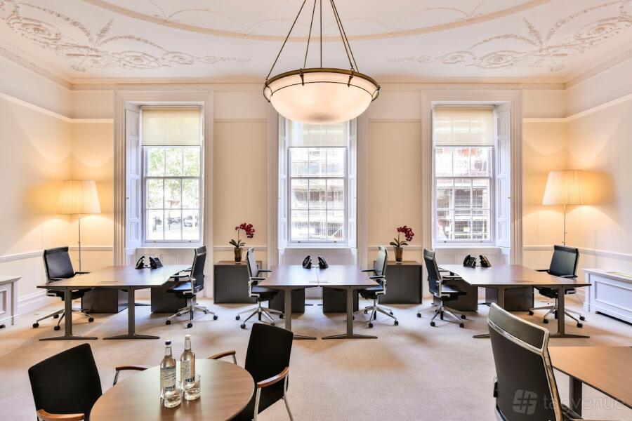 The impressive skylight in the Charrington Room brightens the space to highlight its incredible period features. While they highlight the heritage of the buidling, the sleek, modern furnishings make this a comfortable meeting room for large groups.