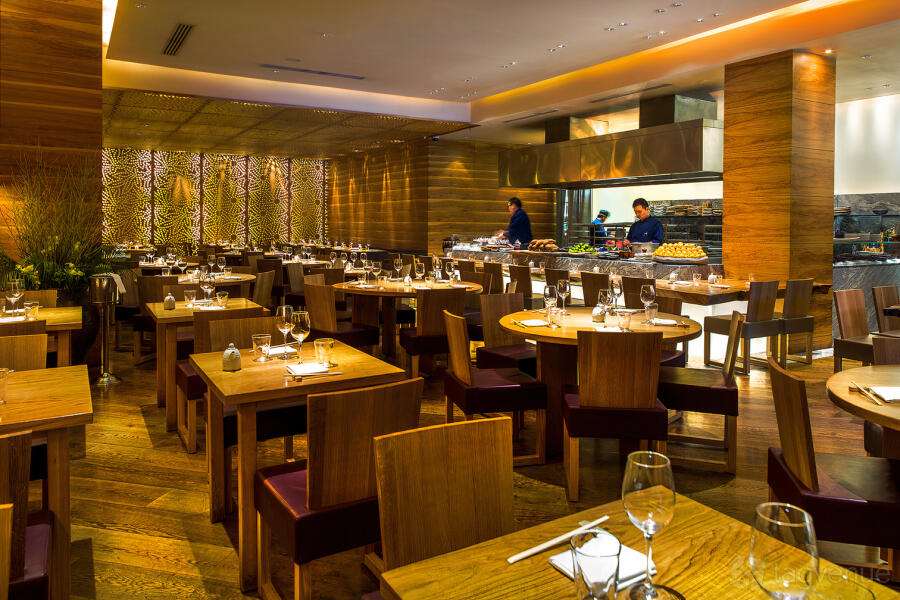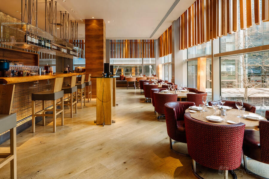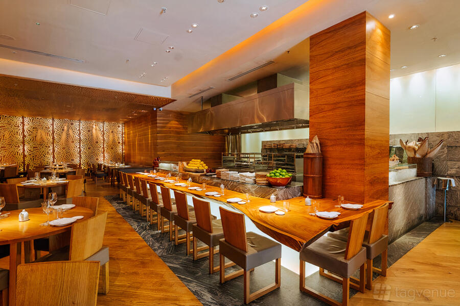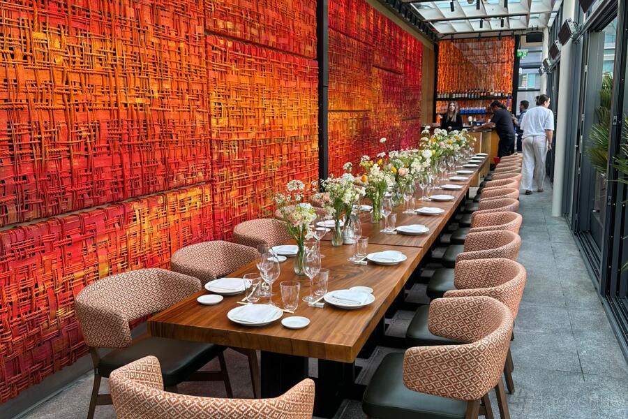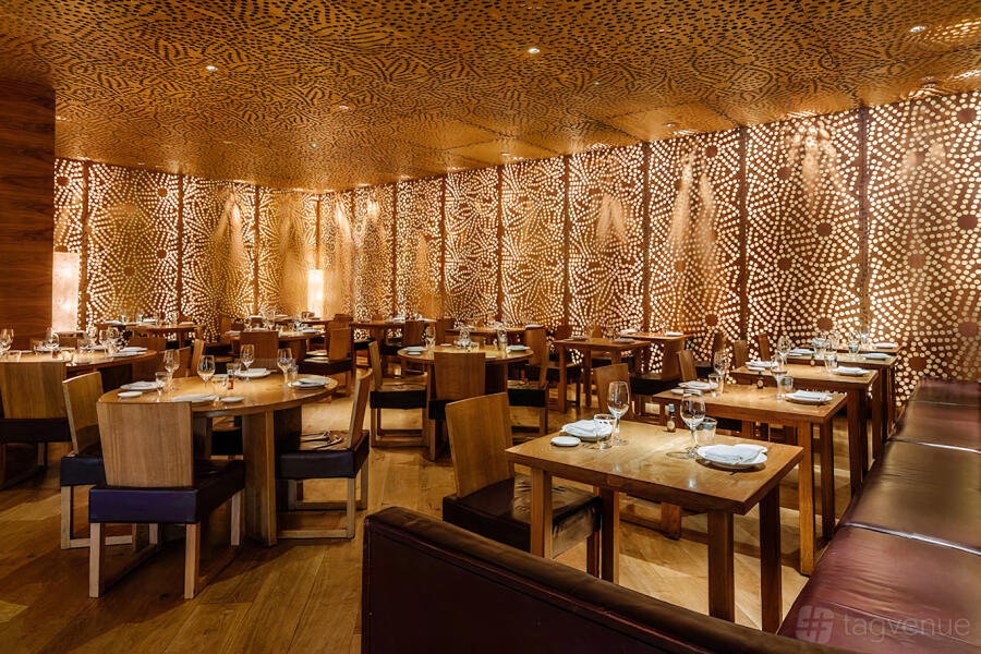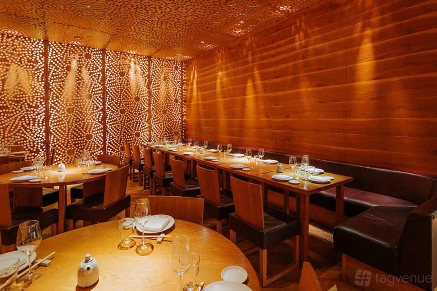 Conveniently nestled amidst the towering high-rises of Canary Wharf, Roka Canary Wharf seamlessly blends into the urban skyline, offering bold Japanese flavors in a sleek, modern setting. Elaborate patterns adorn the walls and ceilings, while solid timber tables and plush leather banquettes provide comfort. The open kitchen with a large robata grill adds to the vibrant ambiance.