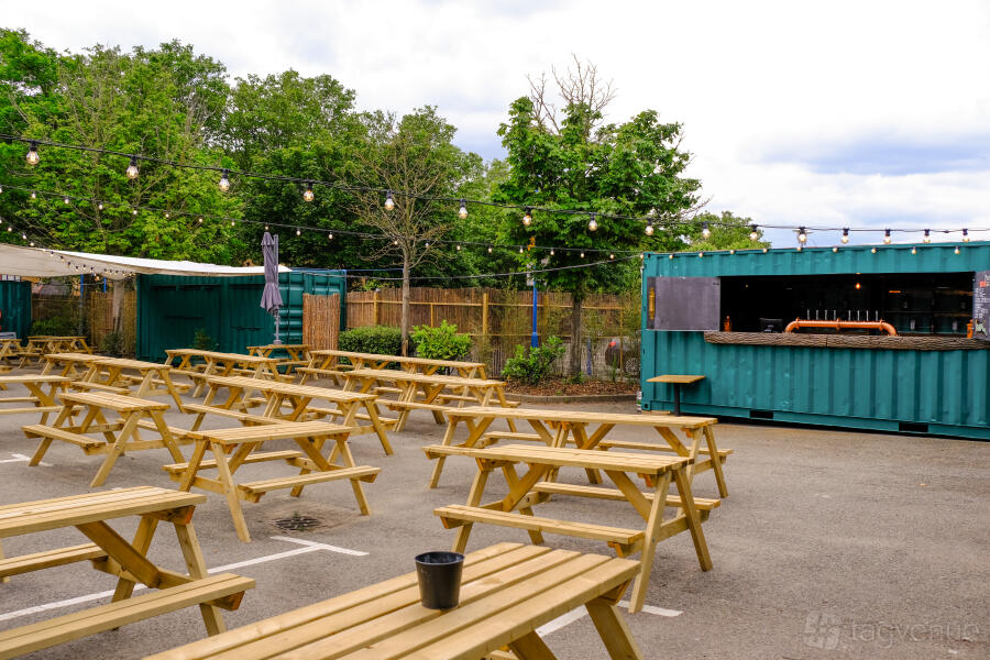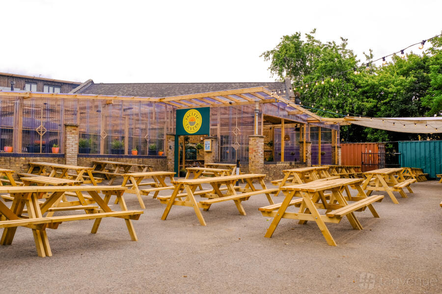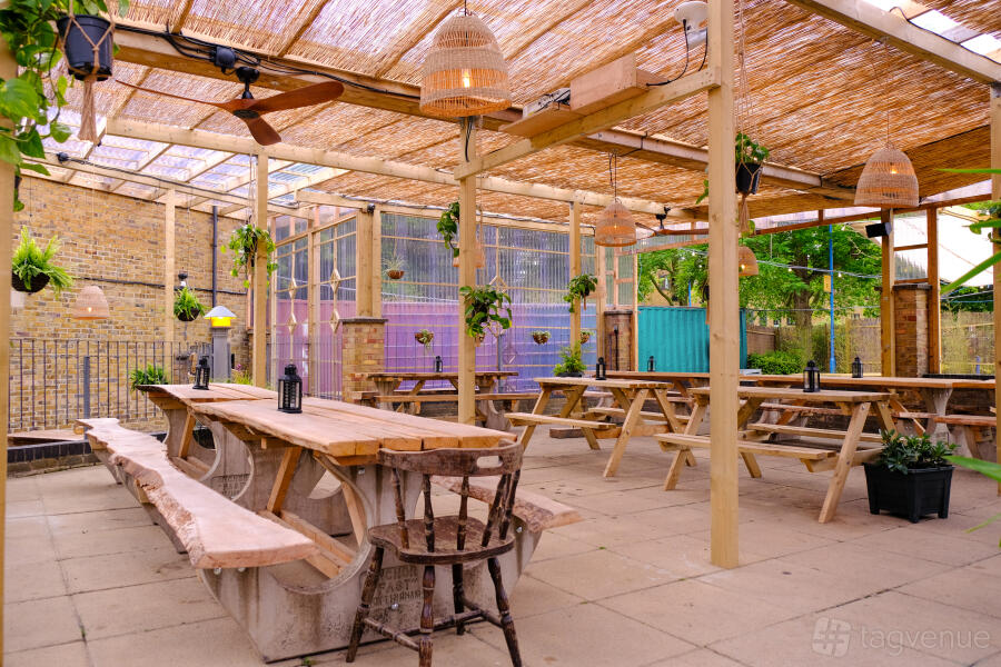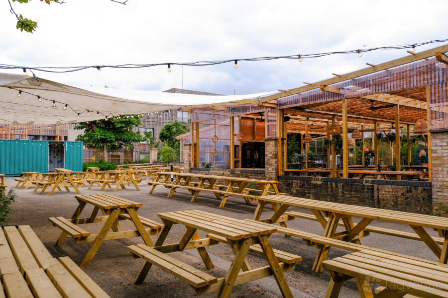 The upper terrace of Pacific Tavern creates an idyllic setting with its rustic dining benches, lush greenery, and enchanting pub garden ambiance. With seating for up to 120 guests or standing room for 150 or more, the terrace spans two levels.